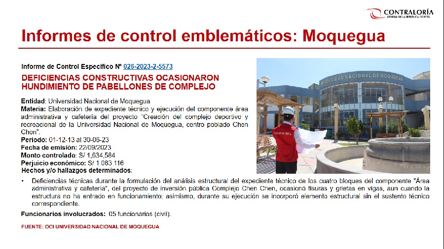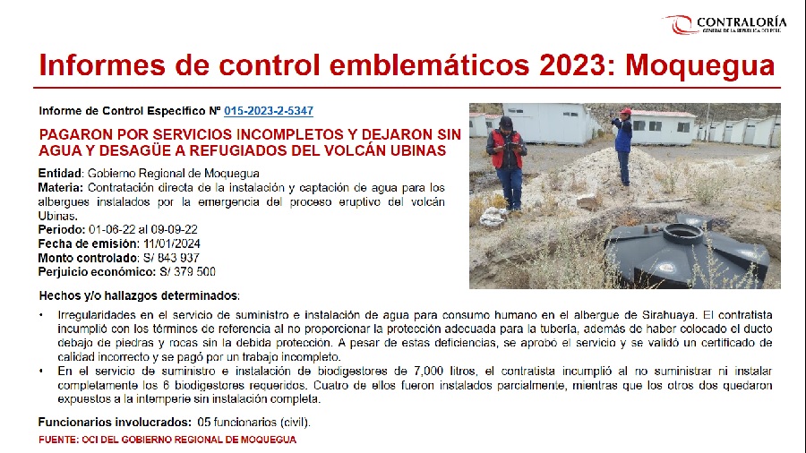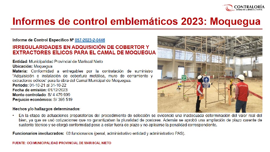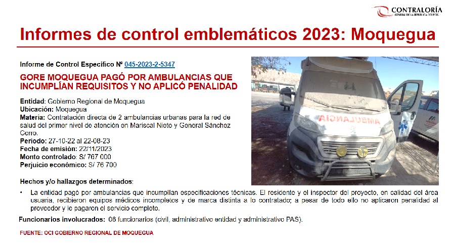 En el Gobierno Regional de Moquegua se identificó S/ 2.6 millones de perjuicio económico por irregularidades en la compra de laptops y gabinetes para el proyecto TIC2, donde se halló presunta responsabilidad en 13 funcionarios (Informe 046-2023-2-5347). También se halló irregularidades en la compra de dos ambulancias que incumplían especificaciones técnicas y no se aplicó penalidad por demora en su entrega. (Informe 045-2023-2-5347).