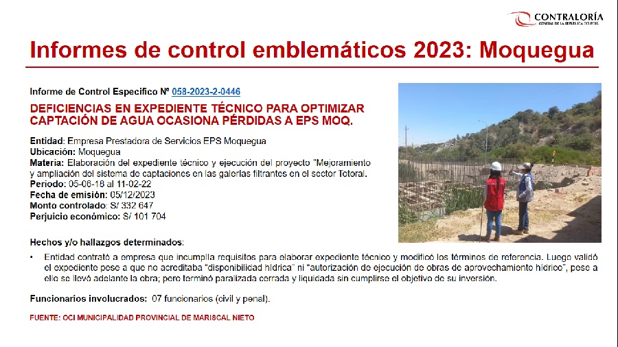 En Mariscal Nieto, se evidenció presunta responsabilidad penal, administrativa entidad y administrativa PAS en servidores de la Municipalidad Provincial de Mariscal Nieto por irregularidades en la instalación de cobertor y extractore eólicos para el Camal de Moquegua (Informe 057-2023-2-0446) y en la Entidad Prestadora de Servicios Moquegua se detectó deficiencias en un expediente técnico para optimizar la captación de agua, lo que generó pérdidas de más de S/ 100 mil y presunta responsabilidad civil y penal en 7 servidores.
