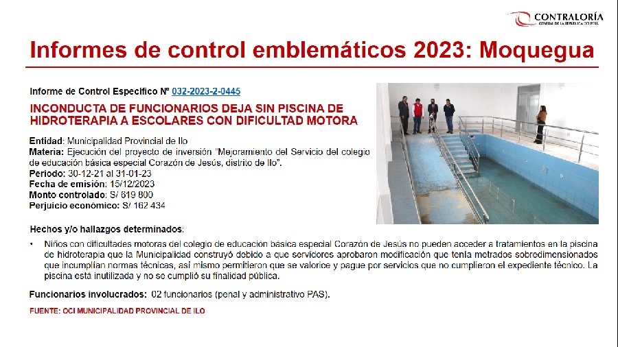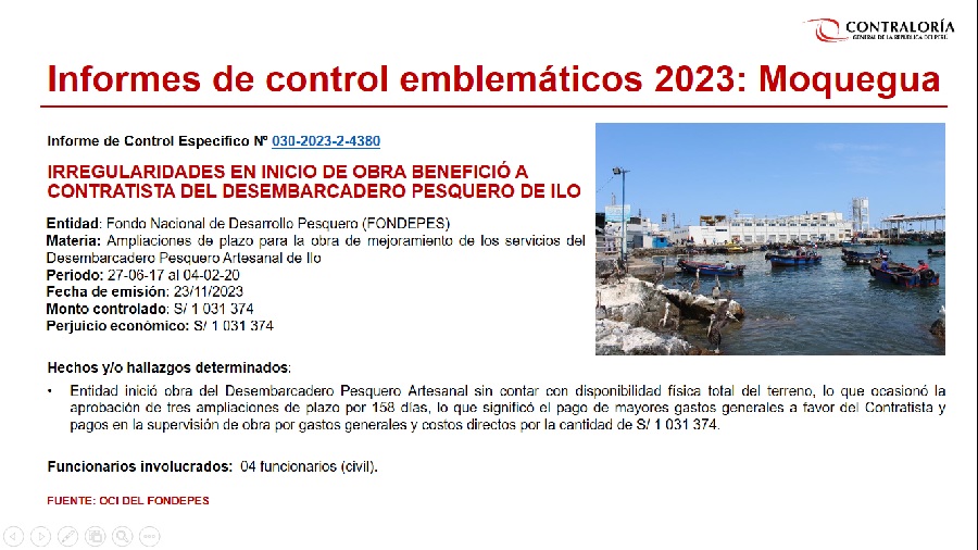 En la provincia de Ilo, se detectaron irregularidades en el inicio de la obra del Desembarcadero Pesquero Artesanal que ocasionó un perjuicio superior a un millón de soles en el Fondo Nacional de Desarrollo Pesquero (Fondepes) y presunta responsabilidad civil en 4 funcionarios (Informe 030-2023-2-4380). También la inconducta de 2 servidores de la Municipalidad Provincial de Ilo dejó a niños de un colegio especial sin piscina de hidroterapia para escolares con discapacidad motora (Informe 032-2023-2-0445).