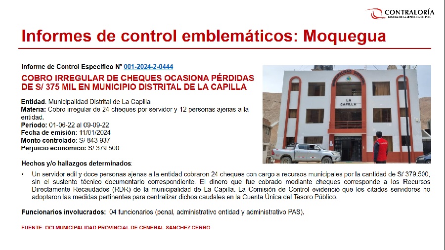 En General Sánchez Cerro se reveló el cobro irregular de cheques en la Municipalidad Provincial de La Capilla por parte de un servidor y 12 personas ajenas a la entidad que se apropiaron de S/ 379 mil de los recursos económicos de la entidad. Aquí se halló responsabilidad penal, administrativa entidad y administrativa PAS en 4 funcionarios. (Informe 001-2024-2-0444).