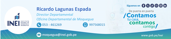 El Instituto Nacional de Estadística e Informática INEI; informó que en el marco de las actividades preparatorias para los Censos Nacionales: XIII de Población, VIII de Vivienda y IV de Comunidades Indígenas, se dio inicio a las actividades de Actualización Cartográfica y del Directorio de Viviendas y Establecimientos en distritos con 20 mil y más habitantes, a nivel nacional. En el Departamento de Moquegua, las actividades de la Actualización Cartográfica y del Directorio de Viviendas y Establecimientos se viene realizando desde el 15 de abril y culminará en diciembre del 2024, en los Distritos de Moquegua, Samegua, San Antonio, Ilo, Pacocha y Algarrobal, así lo informó el Director Departamental de Estadística e Informática de Moquegua Geog. Ricardo Raúl Lagunas Espada.